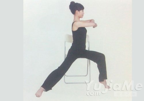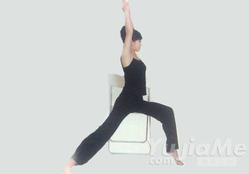 5、身体向左侧旋转,同时左脚跟顺势抬起,身体呈弓箭步。