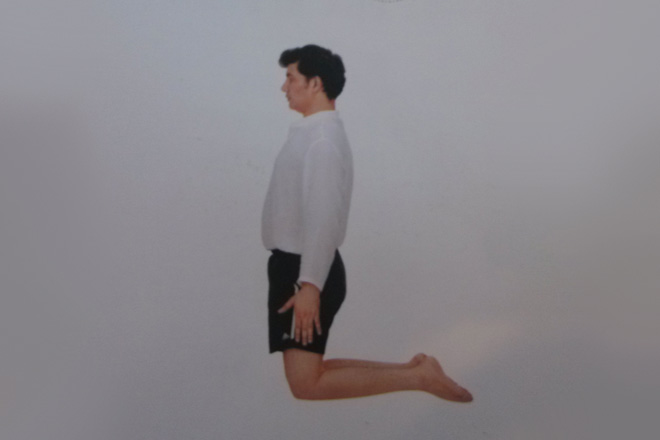 1、跪坐在地面上,上半身挺直,双膝、双脚分开,脚背摊开,脚趾朝后,双臂放于身体两侧,目视前方。