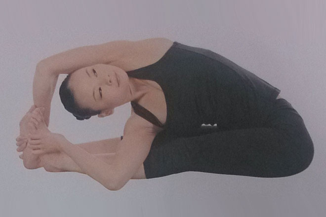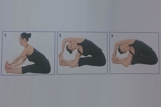 1、以手杖式坐立,膝盖绷直,双腿的膝盖、脚踝、脚后跟和大脚趾想靠。呼气,右臂朝左脚方向伸展,扭转右前臂和右手手腕,使右手大拇指指向地面,右手抓住左脚外侧;左臂向右脚伸展,左手从右脚外侧抓住右脚脚掌。保持一个呼吸的时间。